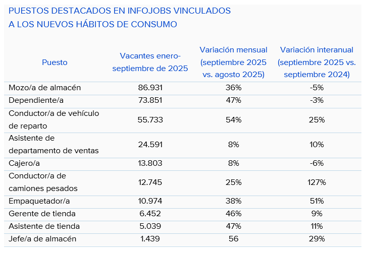 Estos datos sectoriales se concretan en puestos concretos que cada vez son más demandados por las empresas. En este sentido, por ejemplo, los datos de InfoJobs reflejan el peso que tienen las vacantes para puestos como mozo/a de almacén, dependientes/as, conductores/as de vehículos de reparto o de camiones pesados o asistentes del departamento de ventas.