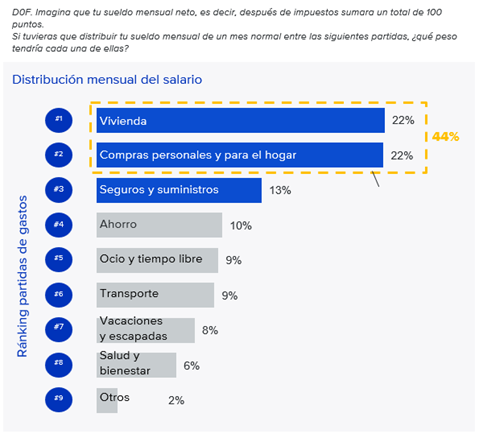 - La vivienda y las compras básicas concentran casi la mitad del presupuesto mensual, mientras que el ahorro supone un 10% del salario