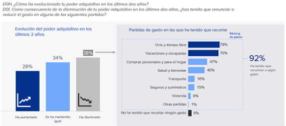 Este equilibrio frágil se rompe entre quienes han visto disminuir su poder adquisitivo en los últimos dos años. La inmensa mayoría, concretamente el 92% de estos trabajadores, ha tenido que recortar gastos, y en la mayor parte de los casos, la reducción afecta a más de una partida. El ajuste se concentra de manera clara en el ocio y el tiempo libre (el 78%), así como en vacaciones y escapadas (75%), que se convierten en la principal vía de adaptación ante la pérdida de capacidad de compra.