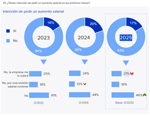 Este contexto de contención económica condiciona la percepción de satisfacción de los trabajadores, así como sus expectativas de mejora. En este sentido, el 33% está descontento con su salario, algo que afecta sobre todo a mujeres menores de 35 años y a quienes tienen salarios bajos o medios. Aun así, la población insatisfecha decrece respecto a la anterior consulta, cuando se registró un 39%, mientras que aumenta la valoración neutral, que pasa del 42% al 47%. Pese a ello, la intención de solicitar un aumento salarial se mantiene en niveles contenidos: el 17% de los trabajadores afirma que tiene previsto pedir un aumento en los próximos meses (hace un año eran el 20% y hace dos el 17%), frente al 83% que no lo hará. Entre quienes no tienen intención de hacerlo, algo más de uno de cada tres lo justifica porque espera recibirlo sin haberlo solicitado o porque ya lo ha recibido. Concretamente, el 21% de los trabajadores declara que próximamente la empresa le subirá el sueldo (dato que baja frente al 24% de 2024 y al 25% de 2023); mientras que el 16% declara haber disfrutado de una revisión salarial reciente.