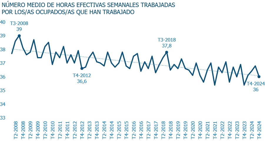En cuanto a la jornada de trabajo efectiva de las personas que trabajan en España, desde hace quince años mantiene una línea descendente, de modo que con las 36 horas actuales (cuarto trimestre de 2024), los ocupados trabajan ahora unas dos o tres horas menos a la semana que lo que trabajaban en 2008, de acuerdo con los datos del INE.