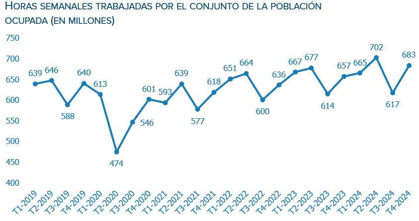 - Las cifras del INE indican que en el cuarto trimestre de 2024 los ocupados trabajaron 36 horas a la semana