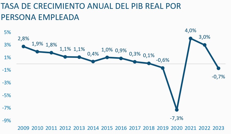 Según el Instituto Nacional de Estadística (INE), el crecimiento anual del PIB real por persona empleada muestra una tendencia a la moderación. En 2023, este indicador registró un descenso del 0,7%, situándose en niveles similares a los de 2019 (-0,6%), antes de la pandemia. Desde 2009, cuando este crecimiento alcanzó el 2,8%, se ha observado una caída progresiva, destacando la necesidad de estrategias para revitalizar el dinamismo productivo.