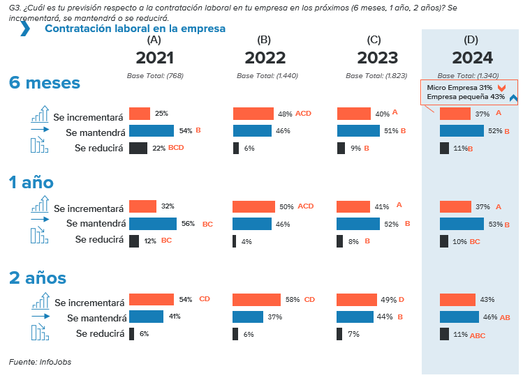 - Las compañías prevén un estancamiento en la contratación tanto a corto como a largo plazo: en seis meses la mayoría abogan más por el aumento que por la reducción, y a en dos años casi la mitad creen que se mantendrán igual