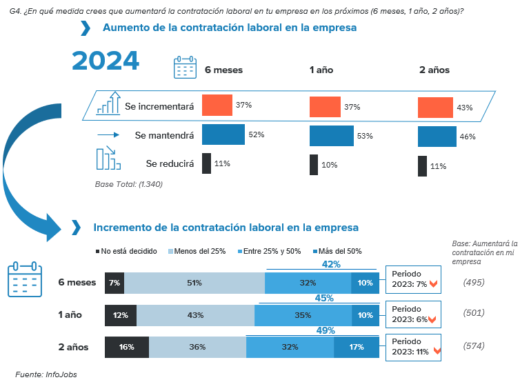 Dada esta situación, no es de extrañar los datos brindados por InfoJobs, la plataforma de empleo líder en España, en su último informe sobre perspectivas de contratación de las empresas en España. De acuerdo con los resultados, el 52% de las compañías declara que mantendrá los niveles de contratación en los próximos seis meses. El 37% señala que la incrementará en ese mismo periodo, y la misma proporción afirma que lo hará en el plazo de un año. Estos datos representan una tendencia a la baja de las perspectivas de contratación, pues el año pasado, el porcentaje de empresas que señalaba que incrementarían la contratación a seis meses vista era del 40% (3 puntos porcentuales más), mientras que el 41% (4 puntos porcentuales por encima) lo afirmaba para un año. Aún hay más diferencias con los recogidos en 2022, cuando un 48% y un 50% de las empresas mejoraban la contratación a corto y medio plazo respectivamente.