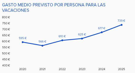 Según los datos del Observatorio Nacional del Turismo Emisor (ObservaTUR), el presupuesto previsto para las vacaciones por persona es de 739 euros. Esto supone un incremento de 62 euros con respecto a 2024, cuando este mismo organismo ofreció una estimación de 677 euros por persona.
