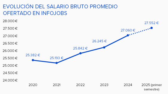 - El salario promedio ofertado por las empresas en InfoJobs durante el primer semestre del año ha sido de 27.552 euros, casi 500 euros más que en 2024