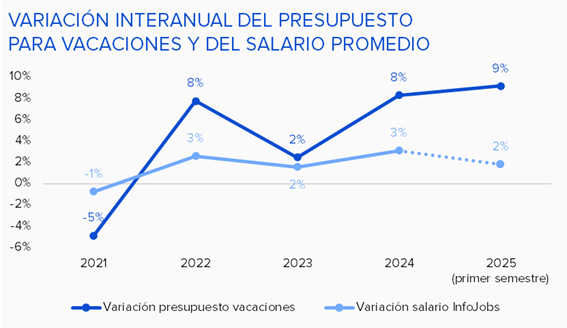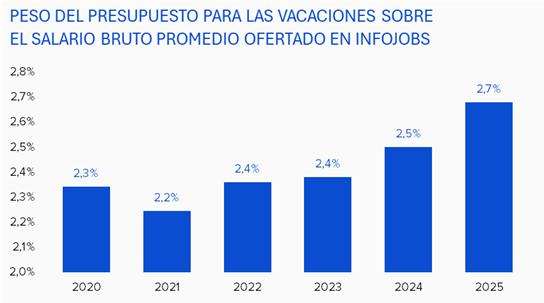 - El presupuesto para vacaciones cada vez tiene más peso sobre los ingresos de los trabajadores/as: en 2025 destinarán un 2,7 % del salario bruto promedio