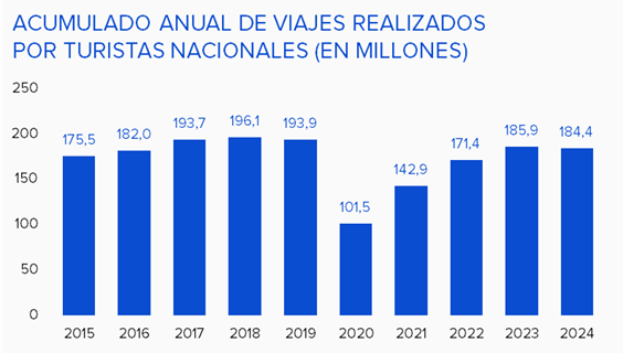 Esta situación, además, puede explicar la ligera contracción (-0,8 %) de los viajes realizados por los turistas nacionales en 2024 con respecto al año anterior, tal y como refleja la Encuesta de Turismo de Residentes publicada por el INE. Concretamente, en 2024 los españoles realizaron 184,4 millones de viajes, frente a los 185,9 de 2023. Asimismo, las cifras del pasado año también quedan lejos de las de 2018, cuando los turistas nacionales llegaron a realizar 196 millones de viajes.