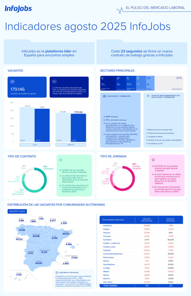 InfoJobs, la plataforma líder de empleo en España, registró el pasado mes de agosto un total de 179.146 vacantes de empleo para trabajar en España, una cifra inferior a la de julio (-17%), cuando se alcanzaron las 217.118 vacantes, y que también queda por debajo de la registrada hace un año, momento en el que se contabilizaron 182.998 puestos de trabajo ofertados (-2%).