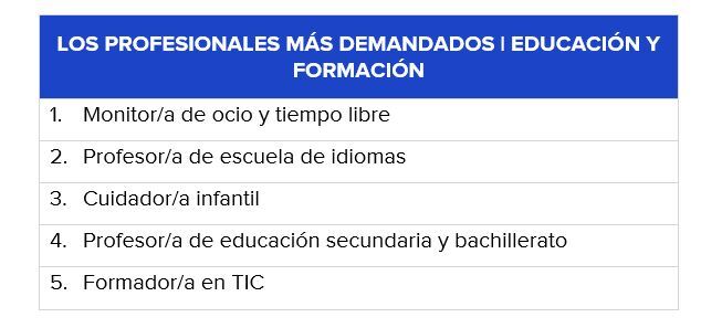 - #LosProfesionalesMásDemandados: monitor/a de ocio y tiempo libre, profesor/a de escuela de idiomas o formador/a en TIC, entre los más solicitados en educación y formación