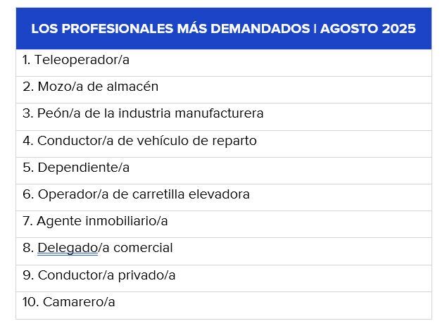 Respecto a los profesionales más demandados en nuestro país, la lista vuelve a estar encabezada, un mes más, por teleoperador/a, con 12.100 vacantes. Les siguen Mozo/a de almacén (10.206) y peón/a de la industria manufacturera (8.579).