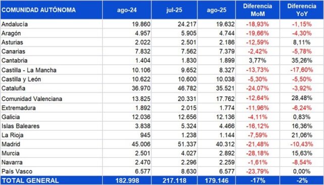 Dentro del análisis por comunidades autónomas, hay que destacar Cantabria, región que crece tanto en la comparativa mensual, con un 4% —siendo la única con cifras positivas—, como en la interanual, donde aumenta un destacado 35%. Si analizamos sólo la comparación con el mismo mes del año anterior, además de Cantabria también hay que destacar la Comunidad Valenciana, La Rioja y Baleares. La primera de ellas crece un 28% frente a agosto de 2024, mientras que las otras dos aumentan sus registros un 21% y 16% respectivamente.