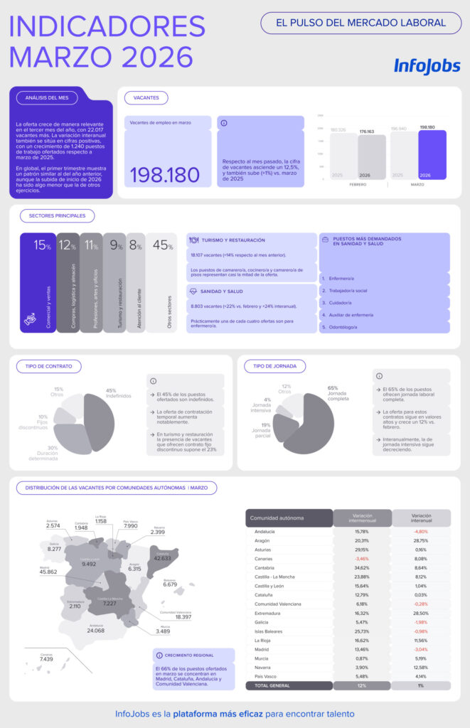 InfoJobs, la plataforma líder de empleo en España, registró el pasado marzo un total de 198.180 vacantes de empleo para trabajar en España, una cifra que se aumenta respecto a la del mes anterior (+12,5%), cuando se contabilizaron 176.163 puestos de trabajo ofertados. En comparación con marzo de 2025 (196.940 vacantes), los datos se mantienen, con un ligero crecimiento del 1%.