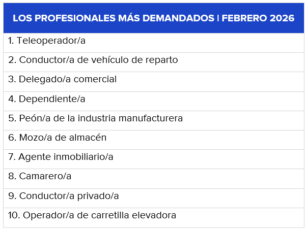 En el mes de febrero, las tres primeras posiciones del ranking de los puestos más demandados las ocupan teleoperador/a, con 10.400 vacantes; conductor/a de vehículo de reparto, con casi 8.800; y delegado/a comercial, con 7.100.