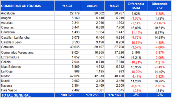 InfoJobs, la plataforma líder de empleo en España, registró el pasado febrero un total de 176.163 vacantes de empleo para trabajar en España, una cifra que se mantiene respecto a la del mes anterior (con un ligero descenso del 2%), cuando se contabilizaron 179.256 puestos de trabajo ofertados. En comparación con febrero de 2025 (180.326 vacantes), la diferencia es la misma (-2%).