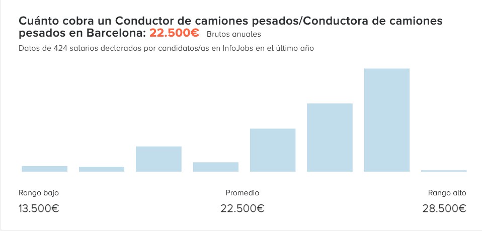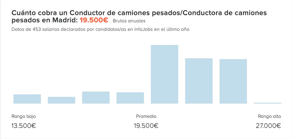 Actualmente, en InfoJobs, el rango salarial promedio de un conductor de camión es de 19.500€ en Madrid, y de 22.500€ en Barcelona. La subida de precios de los carburantes debido a la crisis energética está directamente relacionada también con esta situación salarial.