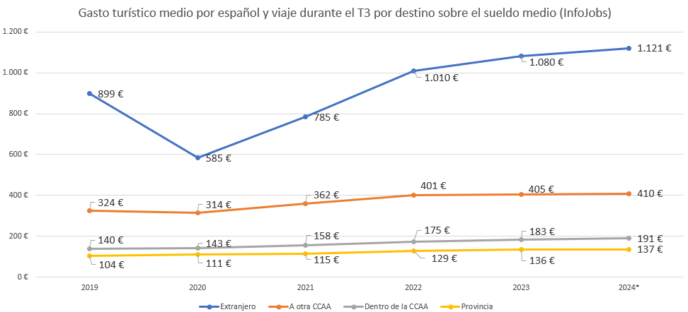 Si se entra al detalle de los datos del tercer trimestre por destino, vemos que los viajes al extranjero, como es lógico, son los que requieren de un porcentaje más alto de salario (concretamente, un 4,1%), al contrario que los realizados dentro de la provincia o de la comunidad autónoma de residencia (ambos por debajo del 1% del sueldo), mientras que los viajes a otras opciones del territorio nacional pueden alcanzar el 1,5%. En cuanto al gasto medio previsto durante los meses de julio, agosto y septiembre en viajes al extranjero, la estimación de InfoJobs es que se podrían necesitar 1.121 euros por persona; en el caso de los realizados dentro de la provincia o la comunidad autónoma, 137 y 191 euros, respectivamente; y en aquellos que tengan como destino otra comunidad, 410 euros. Este cálculo se ha realizado teniendo en cuenta el salario medio bruto anual de InfoJobs (que en 2023 fue de 26.245 euros) y el del primer semestre de este año (27.345 euros), al que se ha aplicado el peso del gasto medio por persona correspondiente a 2023 (4,1% en viajes al extranjero, 0,5% en viajes dentro la provincia y/o la comunidad autónoma, y 1,5% a otra comunidad).