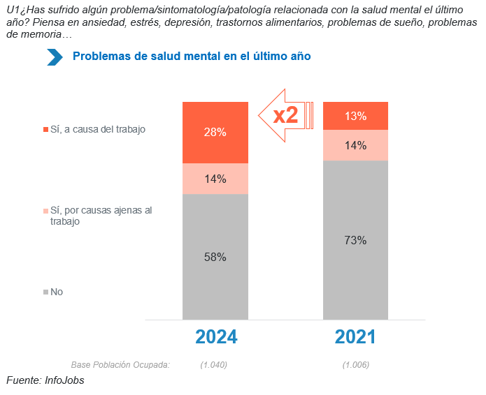 En el ámbito profesional, los desafíos cotidianos se intensifican en este arranque de año, debido a la acumulación de tareas pendientes, la presión laboral y el reajuste horario tras los días de descanso. En este contexto, InfoJobs, la principal plataforma de empleo en España, ha realizado una encuesta sobre Salud mental, cuyos resultados señalan que un 28% de los problemas de salud mental de la población ocupada en España está relacionado directamente con el trabajo. Estos datos duplican a los últimos contabilizados por la plataforma, en 2021, cuando un 13% lo aseguraba. Además, durante el último año, un 42% de los trabajadores afirma haber sufrido algún problema o sintomatología relacionada con la salud mental (vs. el 27% registrado en 2021).
