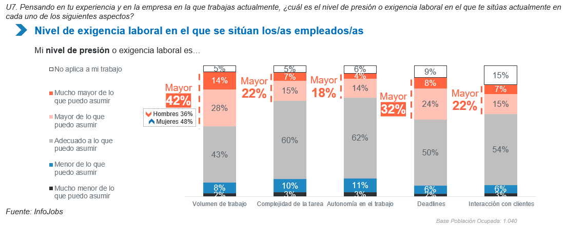Teniendo en cuenta esto, y como es de esperar, el volumen de trabajo (el motivo principal mencionado por los trabajadores) es el aspecto que más aplica al grueso de la población ocupada, y el que más presión está soportando actualmente. Un 42% señala que el nivel de presión o exigencia laboral es mayor o mucho mayor de lo que puede asumir. En concreto, casi la mitad de las mujeres trabajadoras siente que soportan una carga mayor a la que pueden asumir (48% vs. 36% hombres). Muy de cerca se encuentra la presión de los deadlines o las fechas de entrega, aunque aplica a menos trabajadores: 1 de cada 3 siente que la exigencia es mayor a la que puede asumir.