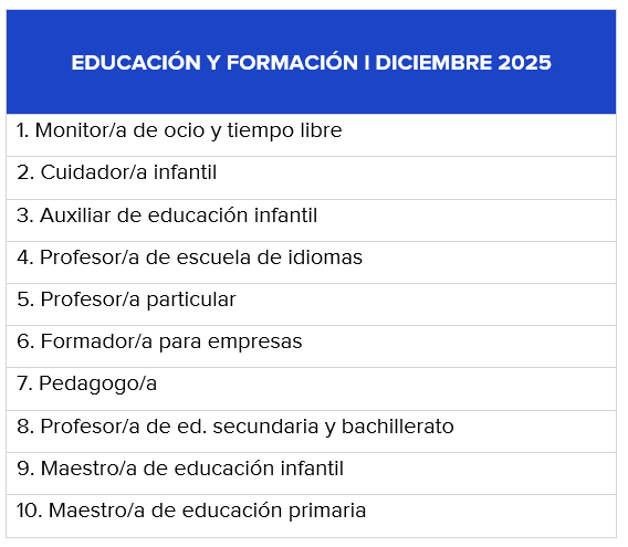 Por otro lado, en el último mes destaca el crecimiento de monitor/a de ocio y tiempo libre (+17%, y más de 1.000 puestos de trabajo ofertados) y de auxiliar de educación infantil que, con más de 400, dobla las cifras del mes anterior. Y en la lista de los que reúnen más vacantes en diciembre también destaca uno relacionado con la transformación digital: formador/a para empresas.