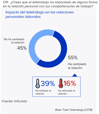 La primera conclusión que puede extraerse del estudio es que más de la mitad de las personas que teletrabajan considera que su modelo ha cambiado la forma de relacionarse con sus compañeros. Para un 39% de los encuestados, este cambio se traduce en un mayor distanciamiento; mientras que casi 1 de cada 5 (16%) avala que su modelo de trabajo le ha permitido que sus relaciones en el entorno laboral hayan sido reforzadas.