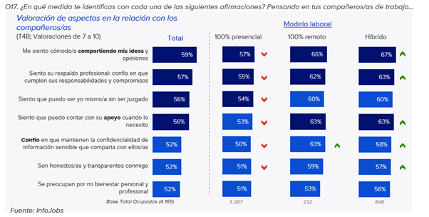 - Sin embargo, al analizar las relaciones personales según el modelo laboral, se observa que los trabajadores en modelos híbridos y remotos registran las valoraciones más altas en confianza (67% y 66%, respectivamente) y apoyo (63% en ambos casos)
