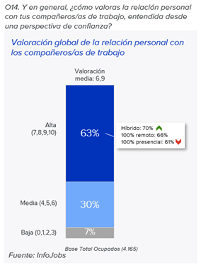 - Independientemente del modelo laboral, 6 de cada 10 españoles perciben su relación con los compañeros como positiva, con una valoración media de 6,9