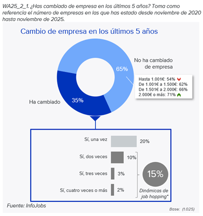Asimismo, el 35% de los trabajadores afirma haber cambiado de empresa en los últimos 5 años. Considerando la dinámica del Job Hopping, se puede considerar que a un 15% de ellos le sería aplicable, pues son quienes han cambiado más de 2 veces de empleo en el periodo analizado. En cuanto al perfil, dicha rotación laboral se concentra en los perfiles más jóvenes. Así, los cambios frecuentes se concentran en menores de 35 años (el 49% de entre quienes tienen entre 16 y 24 años ha cambiado de empleo en los últimos 5 años; mientras que para los de 25 a 34 años el porcentaje es del 58%). La estabilidad aumenta progresivamente con la edad.
