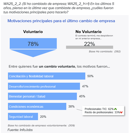 Cuando se pregunta a la población ocupada sobre las motivaciones principales de su último cambio de empresa, 4 de cada 5 trabajadores (78%) indica haberlo realizado voluntariamente, mientras que el 22% lo hicieron de forma involuntaria. Entre quienes declaran que fue un cambio voluntario, los motivos fueron: la conciliación y la flexibilidad (con el 50%); el desarrollo y el crecimiento profesional (47%), el bienestar personal y la salud (45%), las condiciones económicas (38%) –más acusado entre los profesionales TIC, con el 62% de las menciones– y la seguridad laboral (20%).