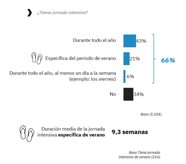 - Con una duración media de 9 semanas, es la más habitual entre las mujeres, los más jóvenes, los trabajadores de los sectores cuaternario y quinario y los de las zonas Centro, Noroeste y Norte; y se sitúa por detrás de la jornada intensiva durante todo el año, de la que disponen 4 de cada 10 profesionales