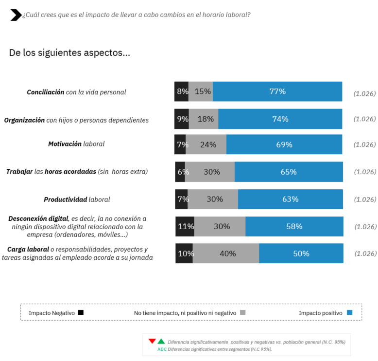 - El impacto de la jornada intensiva es positivo para casi 8 de cada 10 trabajadores, que destacan la mejora de aspectos relacionados con la conciliación, la salud mental, la motivación y la productividad