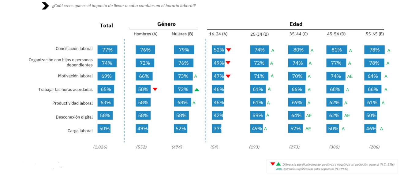 Por franjas de edad, a pesar de disponer de más jornada intensiva en verano (29%), el grupo de 16 a 24 años es el que menos facilidades y beneficios le encuentran, sobre todo en lo que se refiere a motivos estrechamente relacionados con tener cargas familiares, con un 49% (algo lógico ya que los más jóvenes no suelen ocuparse de los cuidados). Por el contrario, las personas de entre 45 y 54 años, por motivos de conciliación (en un 81%) y organización con hijos o personas dependientes (77%), constituyen la franja que más apuesta por este tipo de jornada. La duración de la jornada intensiva de verano es superior en los segmentos más maduros: 10,8 semanas de media para el grupo entre 55 y 65 años y 9,8 semanas para los de 45 a 55 años.