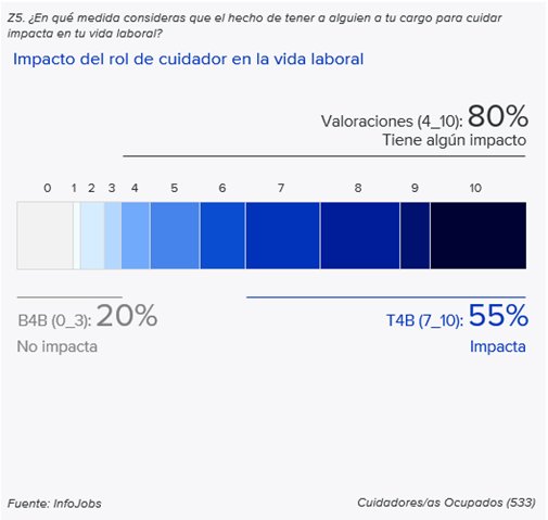 - Este dato resulta relevante, teniendo en cuenta que 1 de cada 10 profesionales en España tiene a su cargo el cuidado de una persona, y 3 de cada 4 asume la responsabilidad de forma íntegra