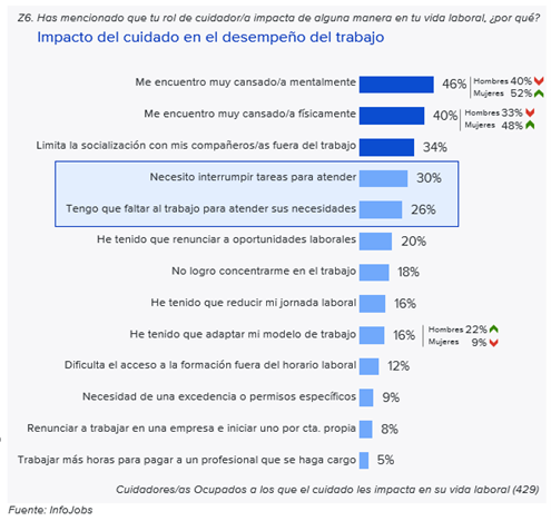 Según los datos de InfoJobs, dentro de este grupo de cuidadores ocupados que declara impacto en su vida laboral, el cansancio mental (46%) y el cansancio físico (40%) son los principales problemas que enfrentan. Este desgaste es mayor entre las mujeres (el 52% y el 48% mencionan el cansancio mental y el físico, respectivamente, vs. el 40% y el 33% de los hombres). A estos síntomas se suma el impacto social: el 34% declara haber visto afectada su vida social fuera del trabajo. Además, el 20% ha tenido que renunciar a oportunidades laborales y un 16% ha reducido su jornada para poder compaginar ambas responsabilidades.